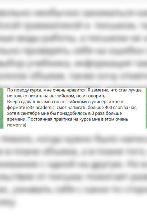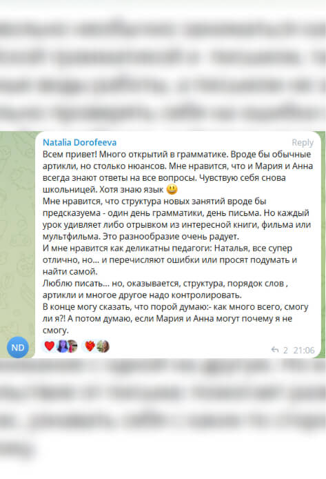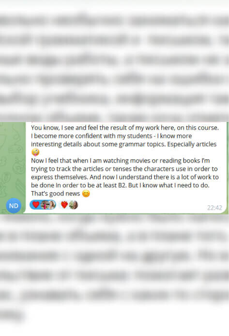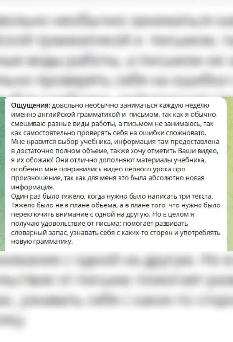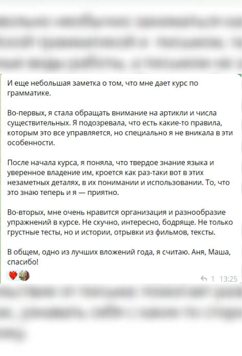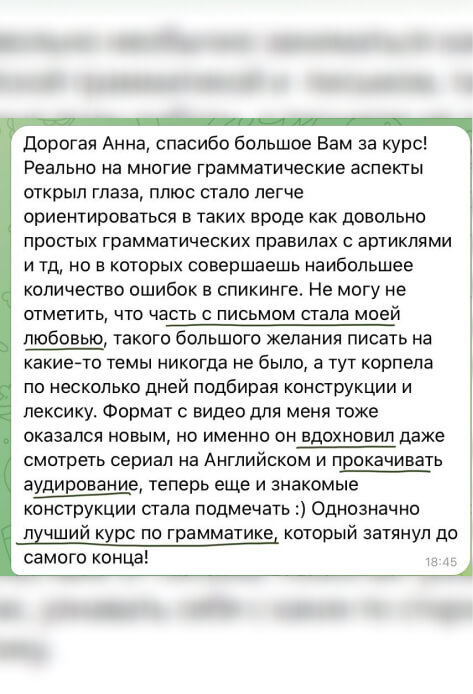 Данный курс я приобрела, чтобы залатать дыры по грамматике. Пока прошла только первый семестр, который длится 12 недель. Но я уже стала увереннее писать на английском, да и говорить тоже. Раньше выкручивалась, полагаясь на интуицию, но меня это не устраивало. Также есть телеграм чат, где можно задавать вопросы по грамматике. Анна всегда отвечает на них :) А от ее заданий в гугл документах я просто в восторге. Очень удобно все заполнять, задания всегда разные, не монотонные. Порой даже удивляешься, неужели это всё? Не терпится начать второй семестр